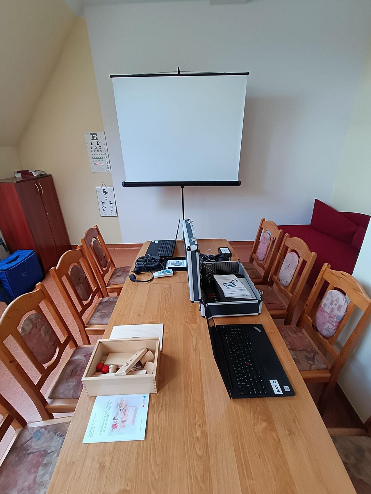 Osprzęt specjalistyczny: projektor, telewizor LCD 42”drukarka EPSON EcoTank L6170, Screeningowy Audiometr Tonalny z testami centralnymi 2 szt., Zestaw Medibalance Pro Profi Set, Audio4lab – Kompletny Zestaw – Wersja Plus, Test Widzenia Barwnego Matsubary 3 Szt., Test Widzenia Przestrzennego “Mucha”/Leaso 3 Szt., Test Widzenia Przestrzennego Tno 3 Szt., Okulary Pryzmatyczne 20,0 Pdptr 48 Mm 3 Szt., Brainboy Universal, Brainboy Universal Slow Version, Audio Trainer 3000, Książkowy Test Widzenia Stereoskopowego, Test Przesiewowy Krzyżkowy Widzenia Binokularnego, Test Przesiewowy Plamkowy Widzenia Binokularnego, Zestaw Megic Pen Do Terapi Padagogicznej,