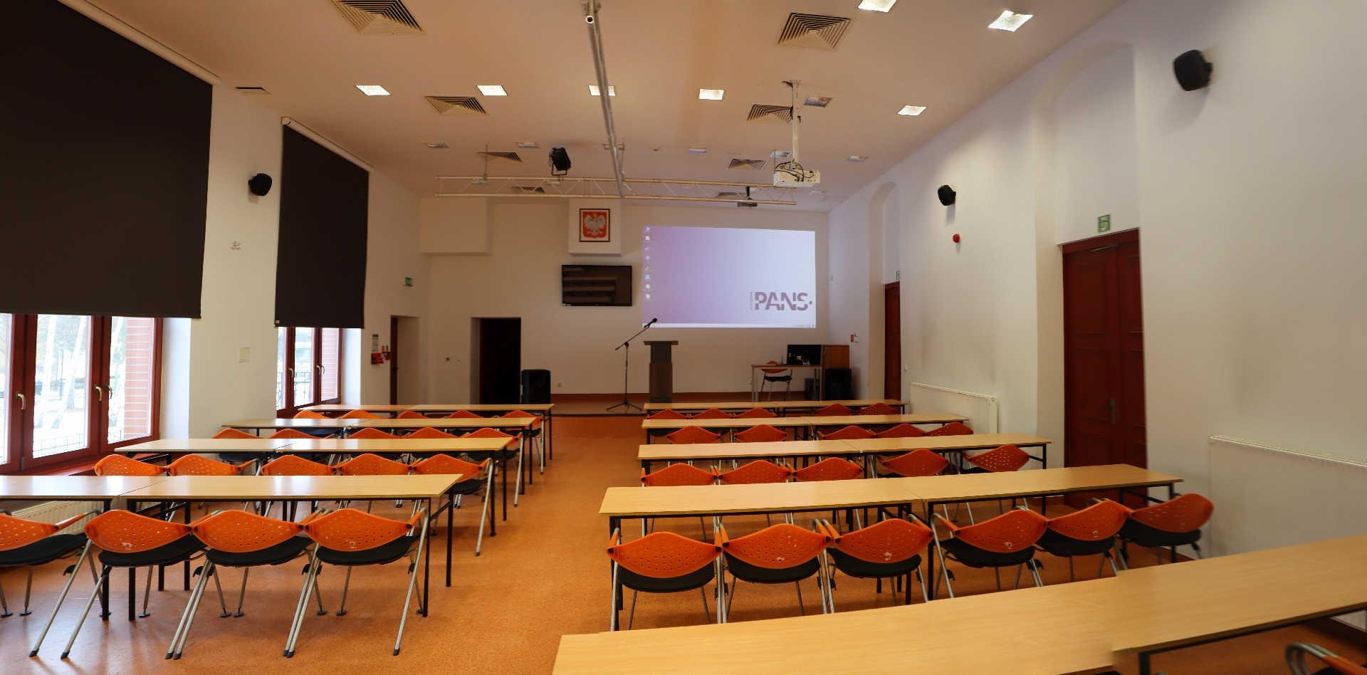 - Wyposażenie: zestaw komputerowy, podwójny system nagłośnienia (naścienny oraz sceniczny) oraz bezprzewodowe mikrofony podłączone do wzmacniaczy wraz z mikserami audio, dwa wysokiej jakości projektory multimedialne, telewizor 52’