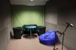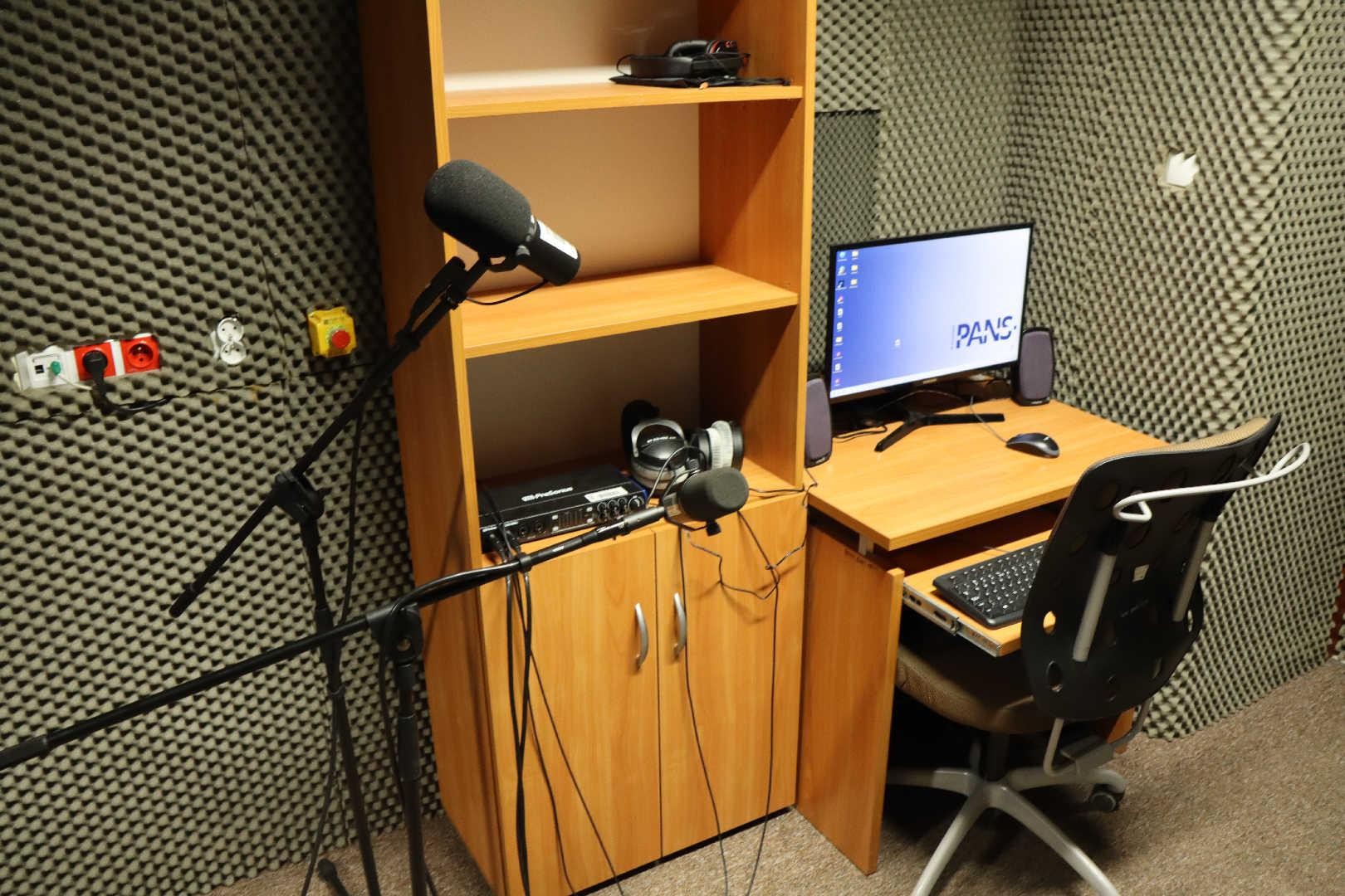 • Charakterystyka: Studio nagraniowe zapewnia profesjonalne warunki do realizacji nagrań i obróbki dźwięku. Wyposażone w nowoczesny zestaw komputerowy oraz specjalistyczne oprogramowanie, umożliwia efektywną postprodukcję audio. Pomieszczenie to zostało doposażone w wysokiej klasy osprzęt oraz narzędzia do nagrywania podcastów, co pozwala na realizację nagrań o wysokiej jakości. Nowoczesna infrastruktura zapewnia komfortowe warunki do pracy twórczej i produkcji dźwiękowej.