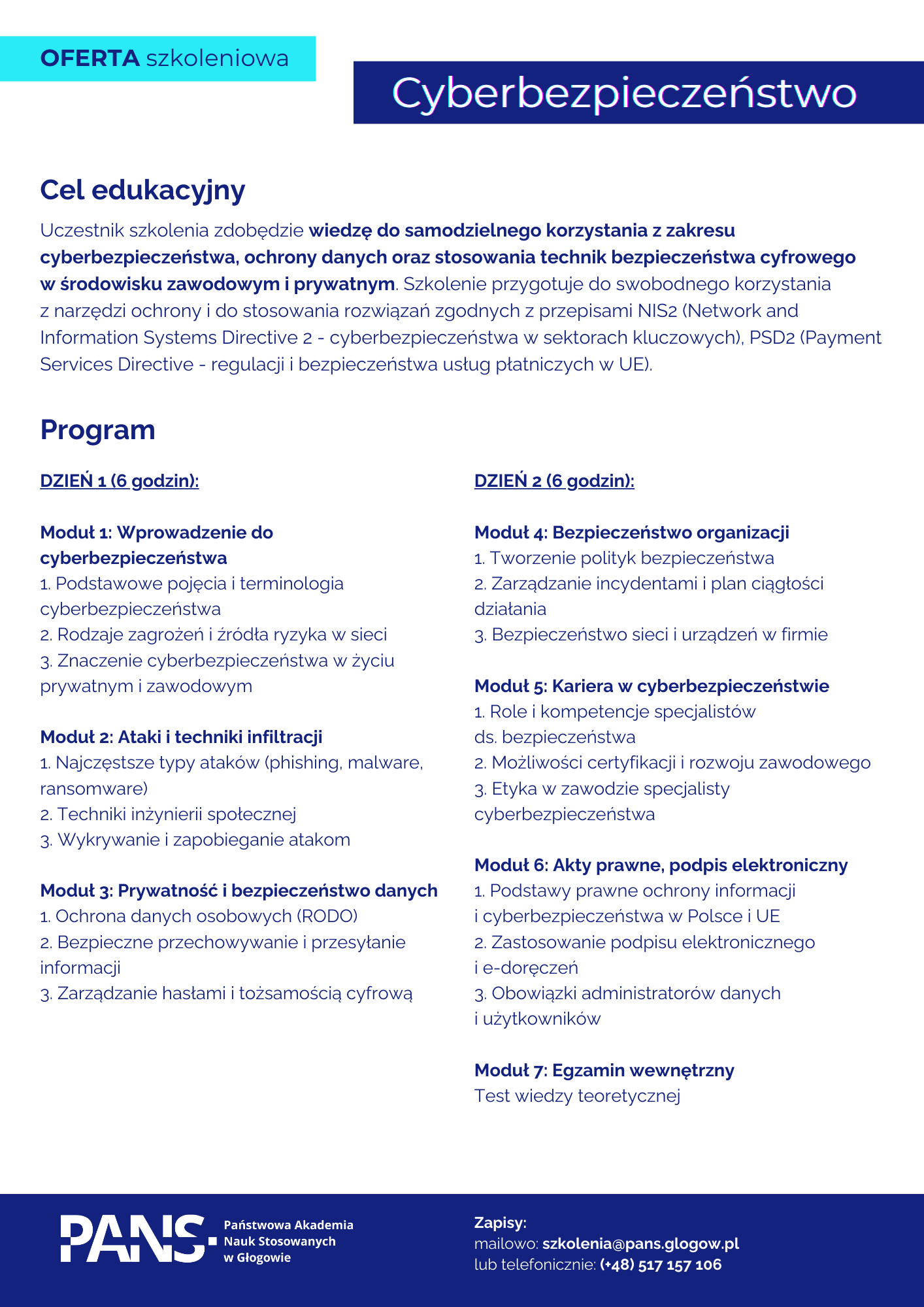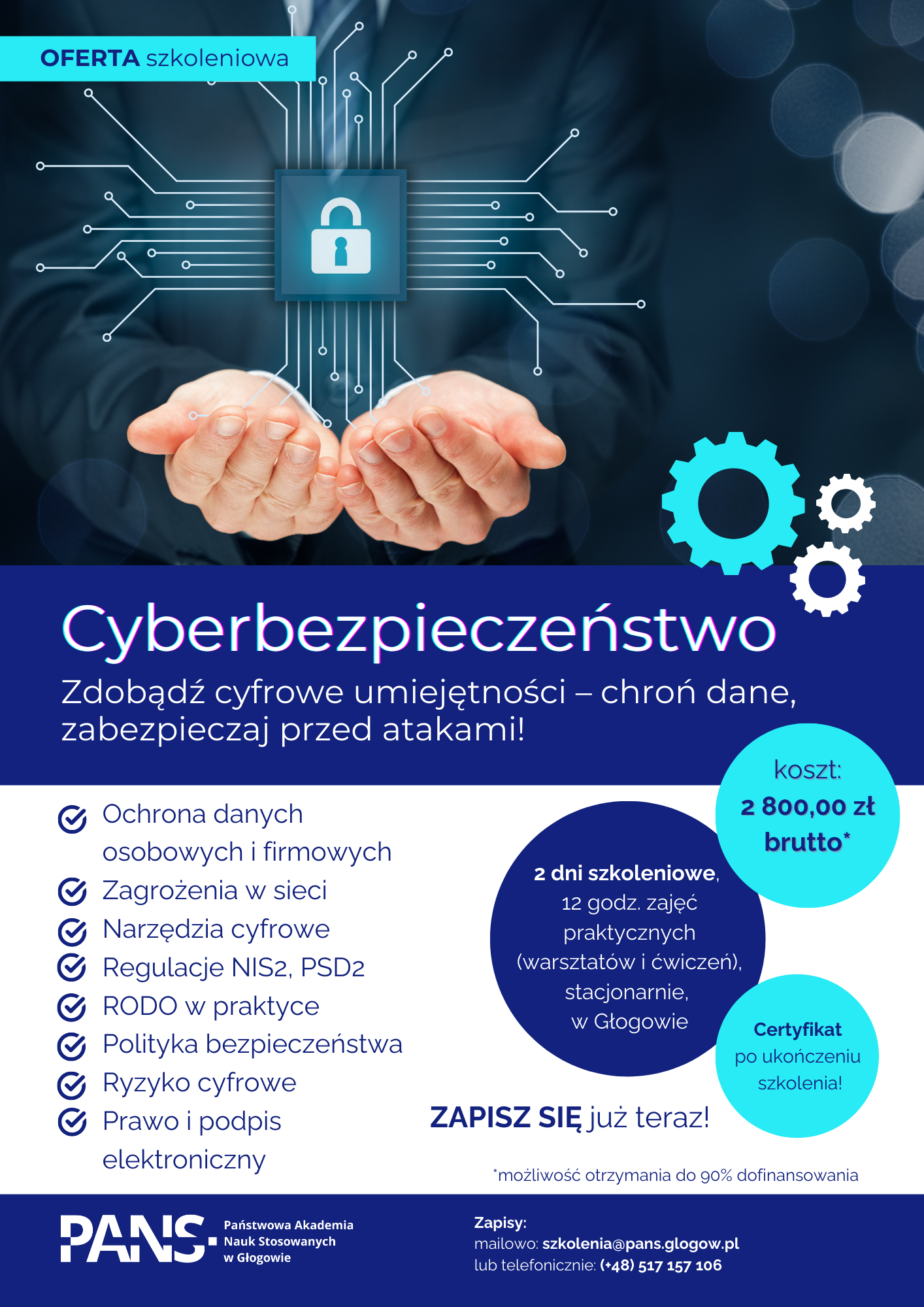 Państwowa Akademia Nauk Stosowanych w Głogowie organizuje szkolenie pt. „Cyberbezpieczeństwo”. Jego celem jest przygotowanie uczestników do samodzielnego korzystania z narzędzi i technik ochrony danych oraz bezpieczeństwa cyfrowego.
